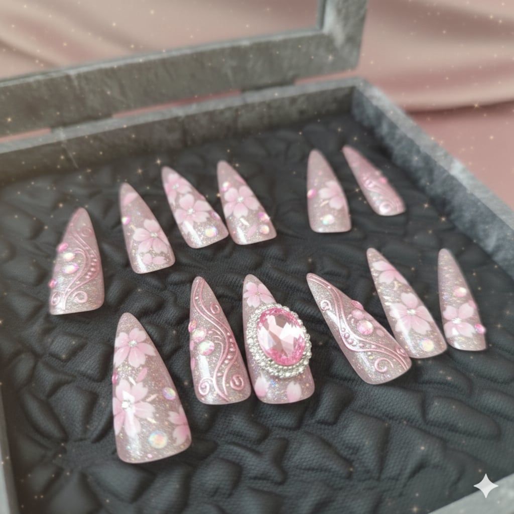 「宵桜(Evening Cherry Blossoms)」のような繊細なアートから、ストーンを贅沢に使ったジュエリーチップまで、プロの技術で形にします。