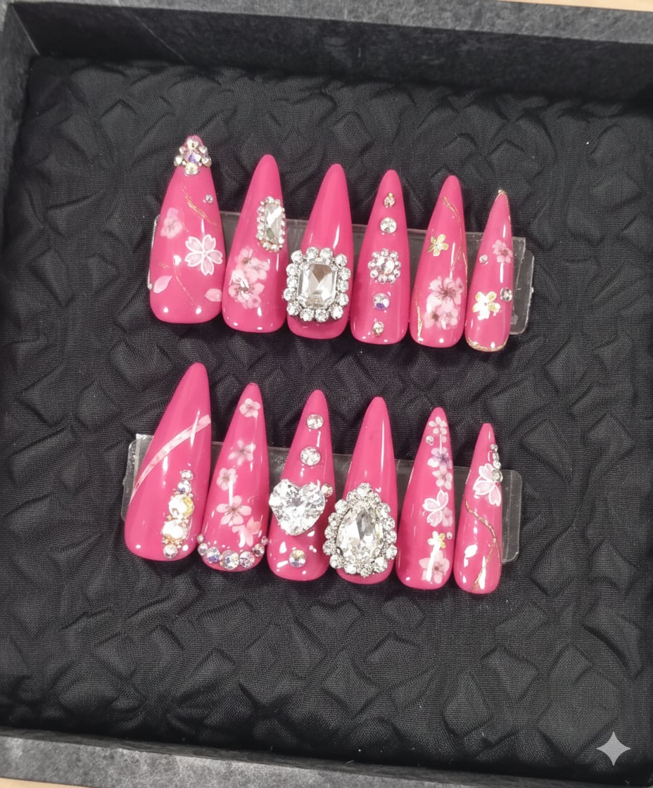 1級ネイリスト厳選のプレミアム素材 「宵桜」を思わせる繊細なフラワーデザインと、贅沢に配置された大粒のビジュー。プロの技術による、取れにくく美しい配置を追求した一点物です。